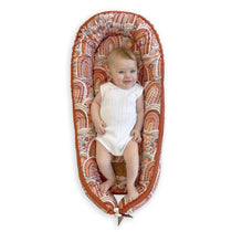 “This artwork (‘Wajunbihn Nunguhny’ Mothers Love) acknowledges the traditional owners of this land, sea and sky. It pays respect to our Elders of the past and present for their strength, knowledge and leadership and to our jarjum’s (children), who are our future Elders. This artwork celebrates the thousands of years and over 1000 generations, of babies born and welcomed onto country, in nature, with the guidance and support of women as part of ceremonial and sacred practices of Women’s Business. The shapes and detailed patterns represent sandhills and the Country, symbolising the baby’s connection to the land. The warm natural colours symbolise the ochre and colours of the land” - Holly Sanders