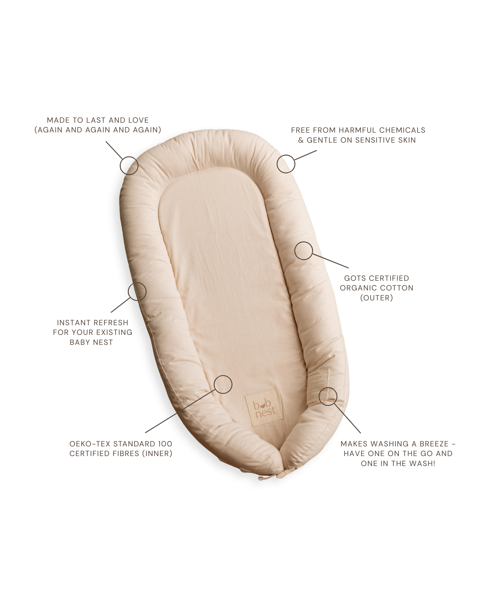 Life with a baby can get messy — and that’s where our Baby Nest Spare Cover becomes a must-have. Made from 100% GOTS-certified organic cotton, it’s soft, breathable and perfectly gentle for your baby’s delicate skin. The tailored fit and full zip make changes quick and effortless, while the machine-washable design keeps things simple for busy parents. Ideal for rotation, travel or keeping a fresh cover on hand, it ensures your Baby Nest stays clean, comfortable and ready for everyday use. Whether for your current little one or as a refreshing cover for your next baby, it brings peace of mind to every Bubnest parent.