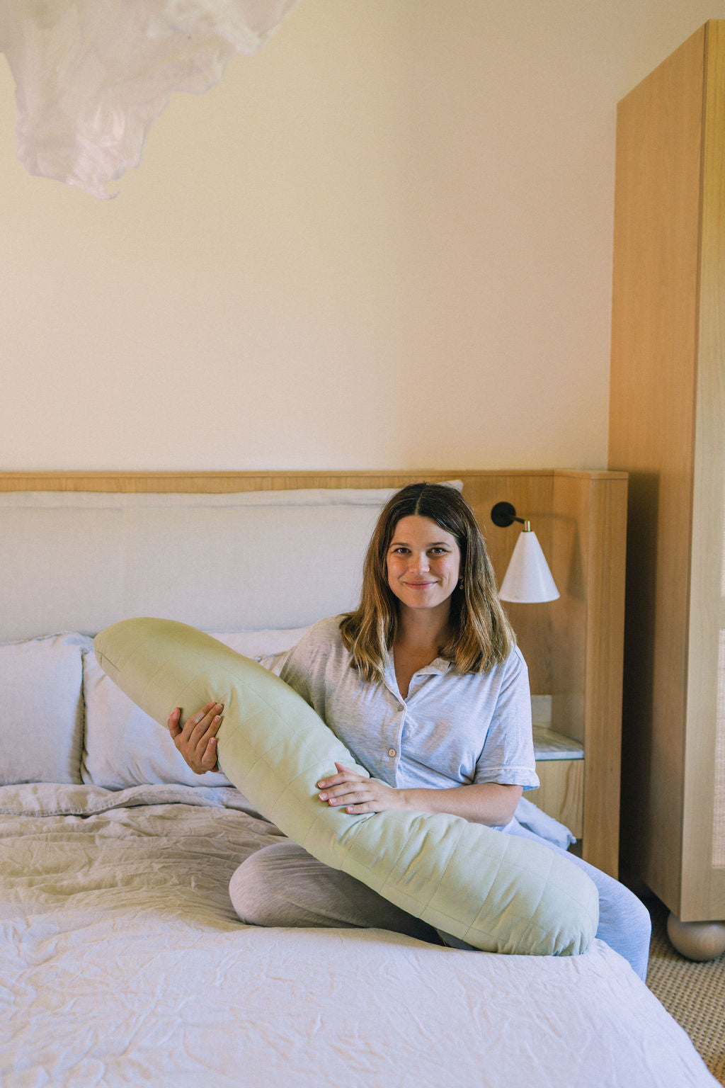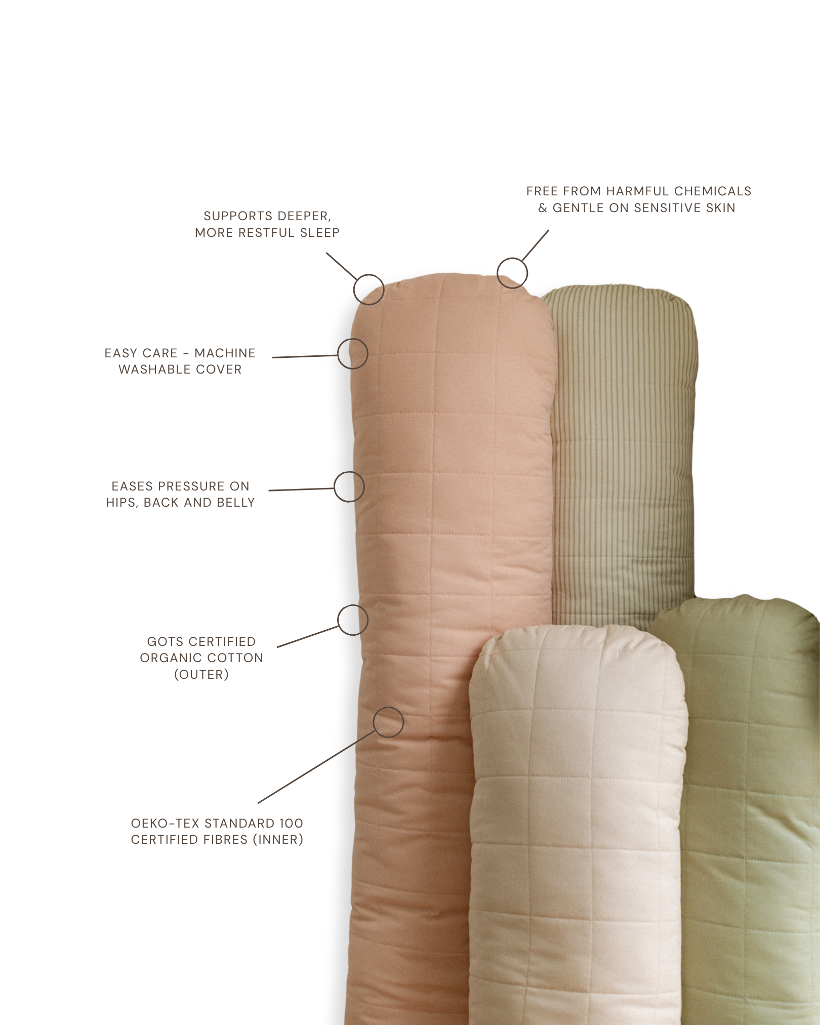 The Pregnancy Pillow provides soft, full-body organic support to ease pressure, improve sleep and bring comfort from pregnancy through to postpartum support.
