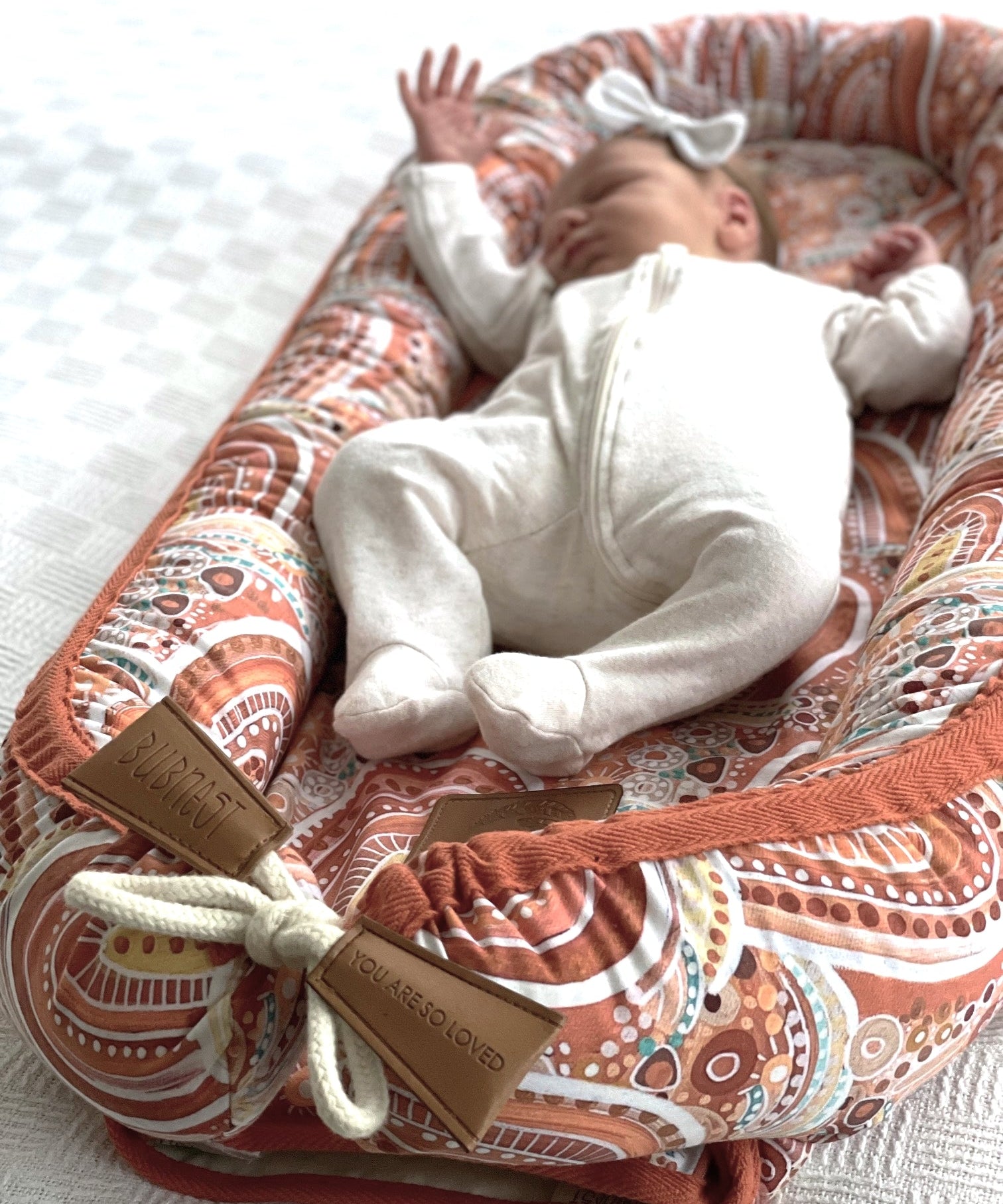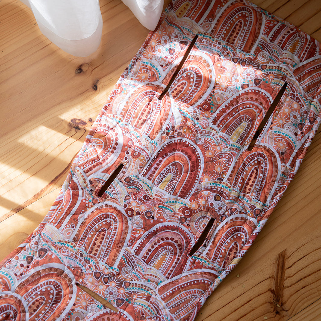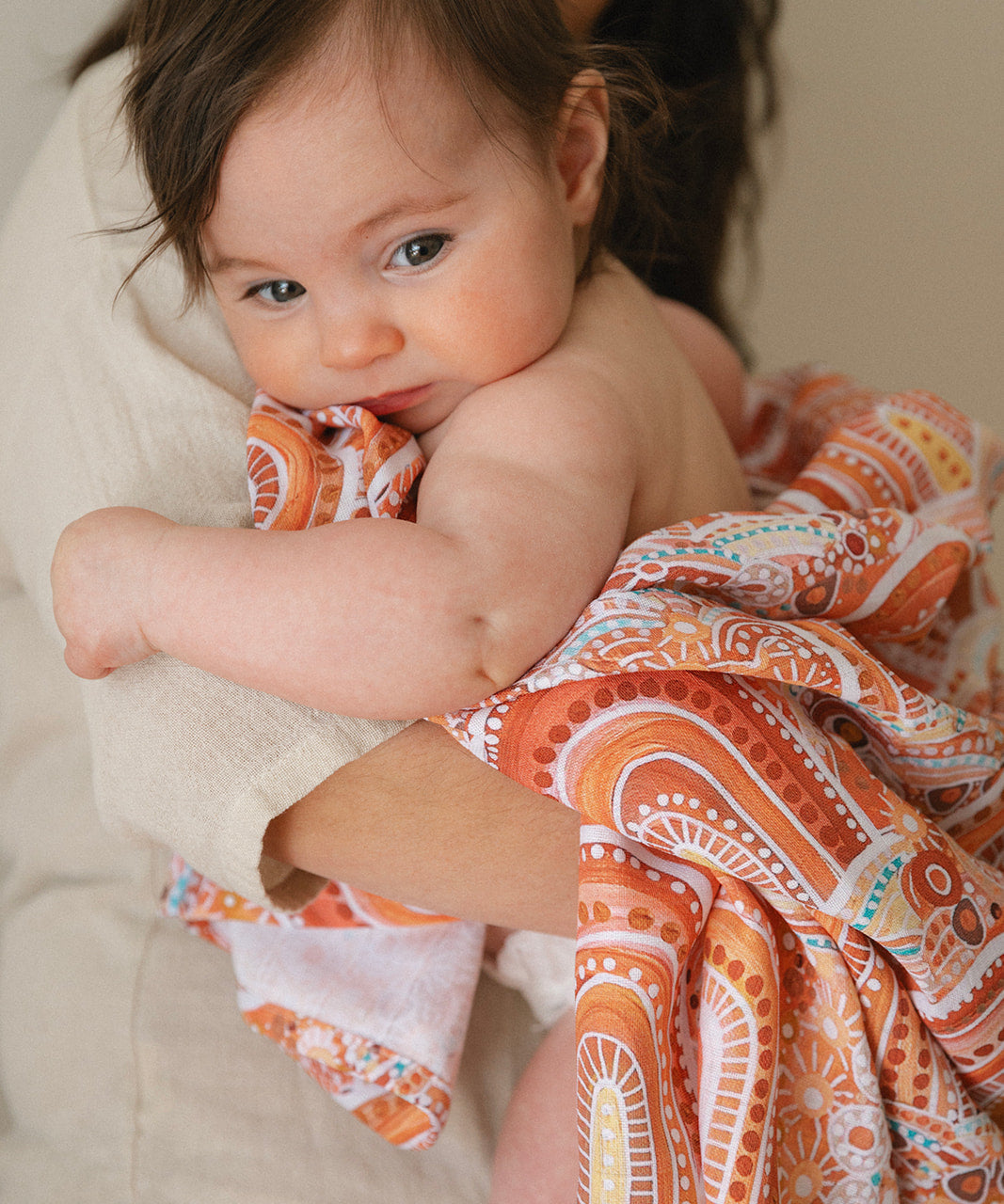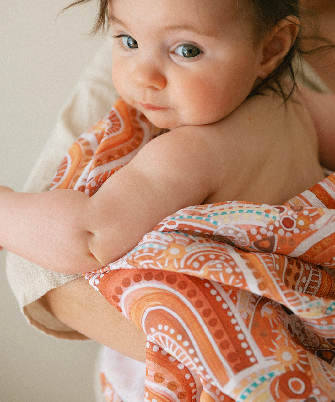“This artwork (‘Wajunbihn Nunguhny’ Mothers Love) acknowledges the traditional owners of this land, sea and sky. It pays respect to our Elders of the past and present for their strength, knowledge and leadership and to our jarjum’s (children), who are our future Elders. This artwork celebrates the thousands of years and over 1000 generations, of babies born and welcomed onto country, in nature, with the guidance and support of women as part of ceremonial and sacred practices of Women’s Business. The shapes and detailed patterns represent sandhills and the Country, symbolising the baby’s connection to the land. The warm natural colours symbolise the ochre and colours of the land” -Holly Sanders