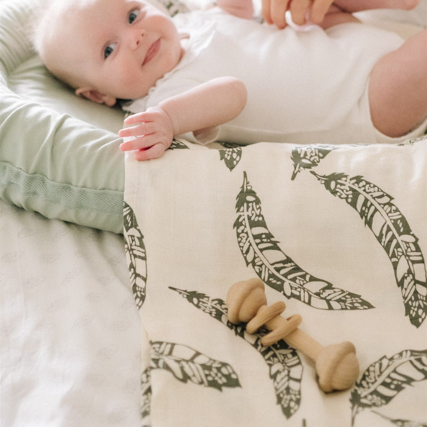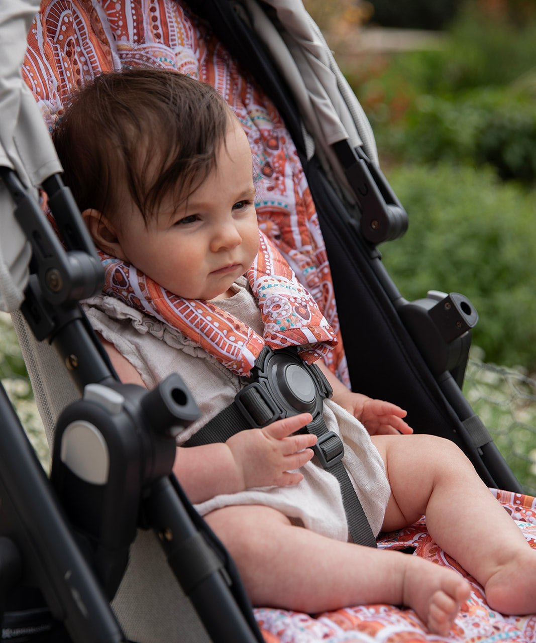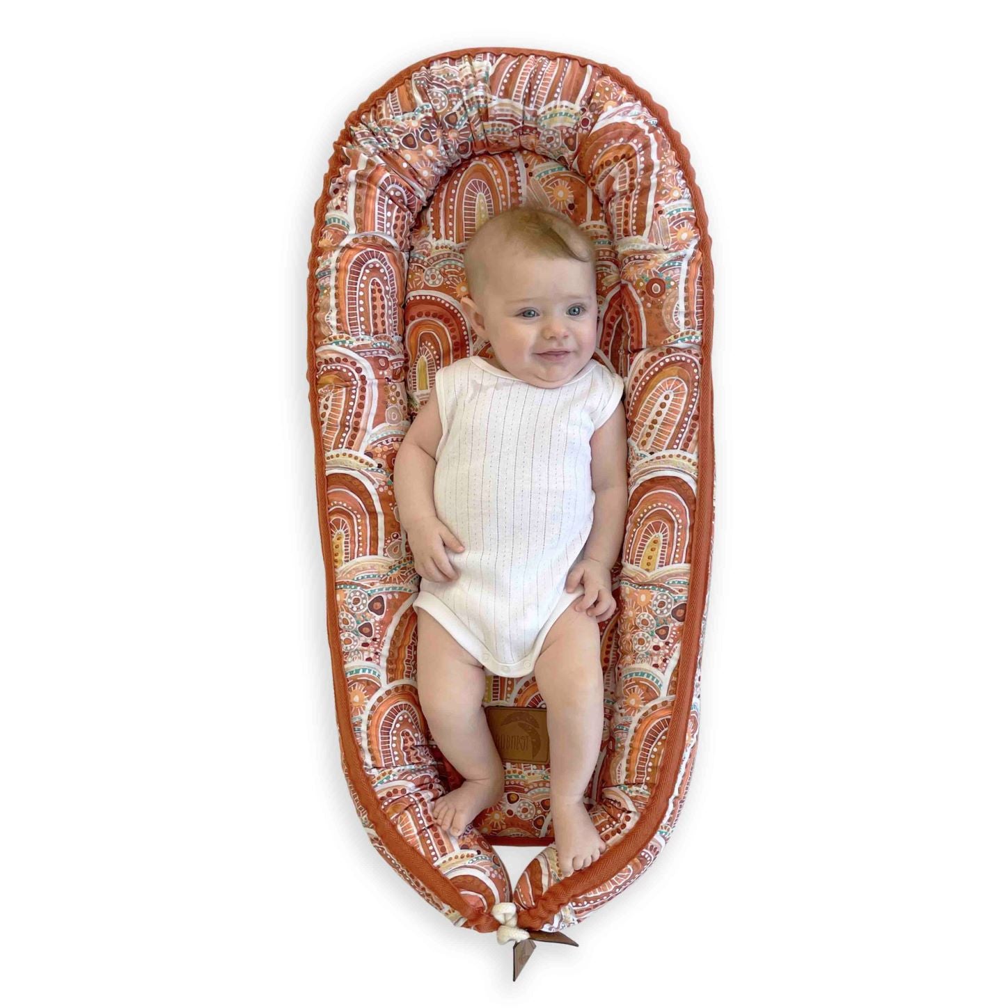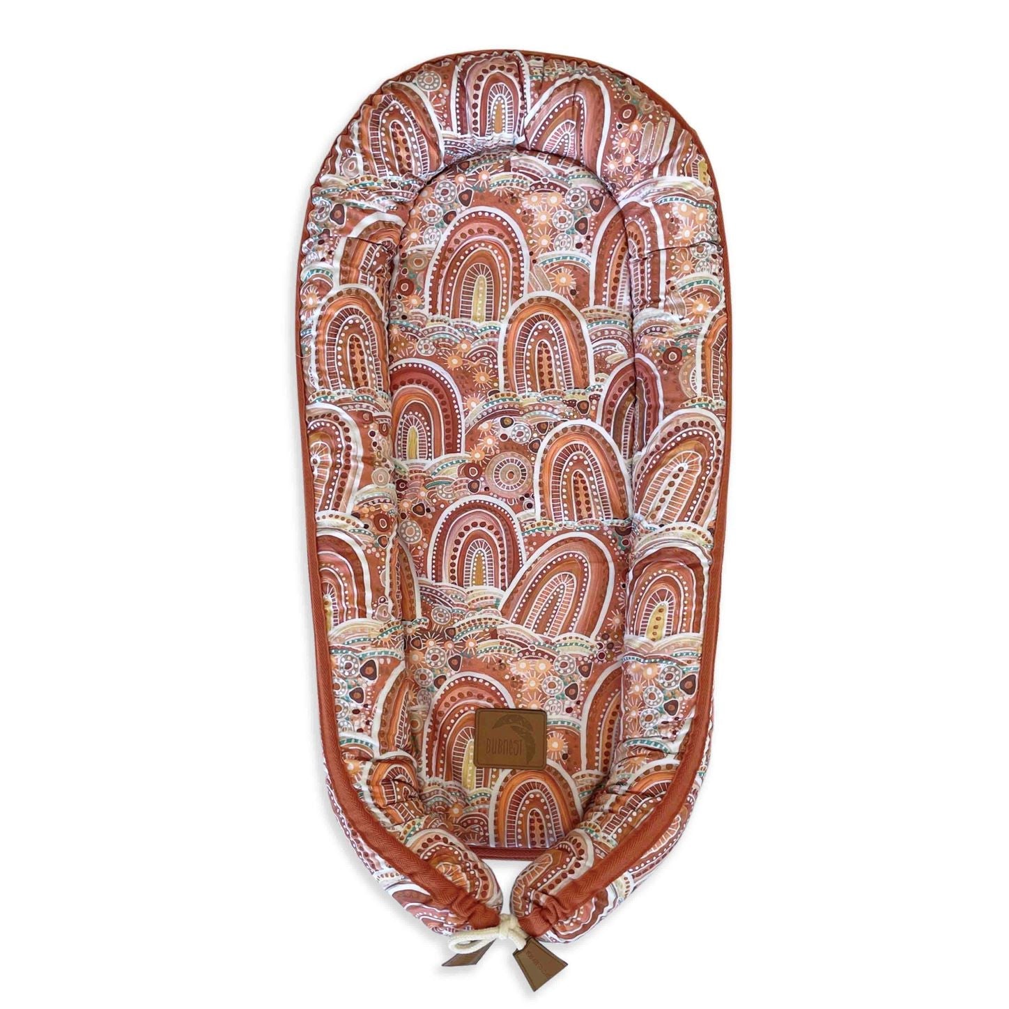 “This artwork (‘Wajunbihn Nunguhny’ Mothers Love) acknowledges the traditional owners of this land, sea and sky. It pays respect to our Elders of the past and present for their strength, knowledge and leadership and to our jarjum’s (children), who are our future Elders. This artwork celebrates the thousands of years and over 1000 generations, of babies born and welcomed onto country, in nature, with the guidance and support of women as part of ceremonial and sacred practices of Women’s Business. The shapes and detailed patterns represent sandhills and the Country, symbolising the baby’s connection to the land. The warm natural colours symbolise the ochre and colours of the land” -Holly Sanders